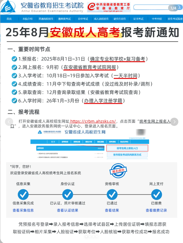 2025年报名时间预计8月20日启动,具体以安徽省教育厅公告为准