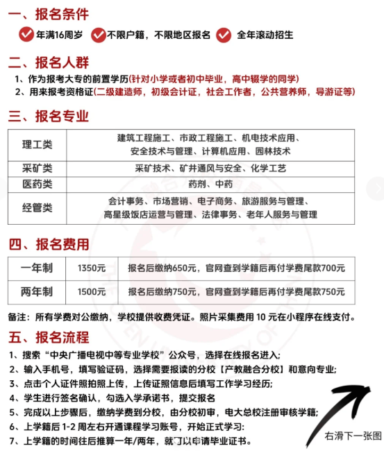 一年制专业:总费用 1500 元左右,涵盖建筑工程施工、会计事务、电子商务、计算机应用等热门专业,分两次缴纳 —— 报名时缴纳一半(750 元),学籍注册成功后缴纳剩余款项;