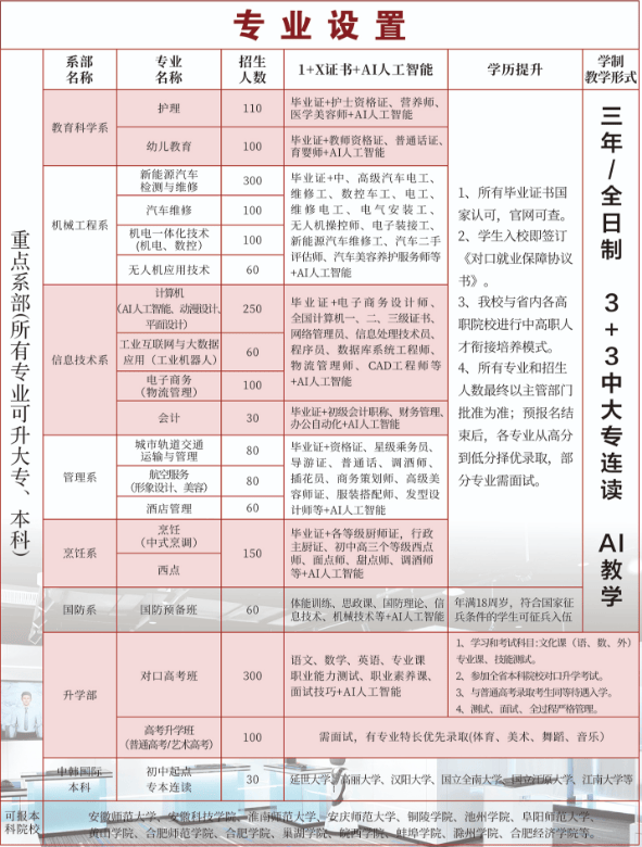 升学端:所有专业支持 “3+3 中大专连读”,后续可衔接省内高职对应专业;还有对口高考班可选,能冲刺本科院校,技能、学历两不误。