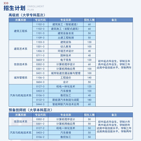 专业方向涵盖建筑工程、建筑艺术、信息技术、城市管理、汽车与机电五大领域,包括建筑施工、幼儿教育、电子商务、机电一体化技术、新能源汽车制造与装配等热门专业,适配不同兴趣与职业规划的学生。
