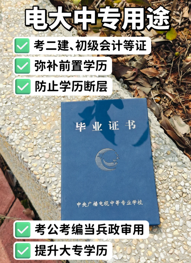 证书颁发:毕业后,由中央广播电视中等专业学校颁发国家承认的中等专业学校毕业证书。该证书可用于报考二级建造师、初级会计师等职业资格证书,也可作为升大专、当兵、入户、考公、考编、政审等的前置学历。