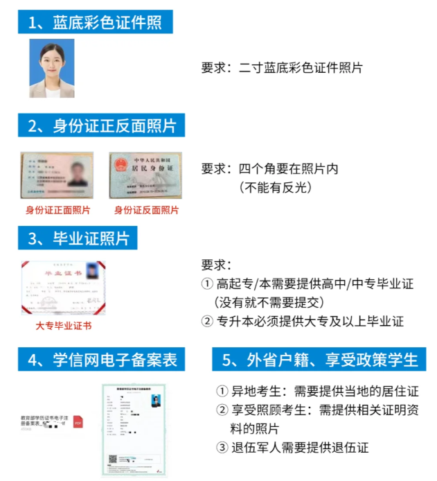 外地户籍考生需另外上传居住证原件、2寸证件照。