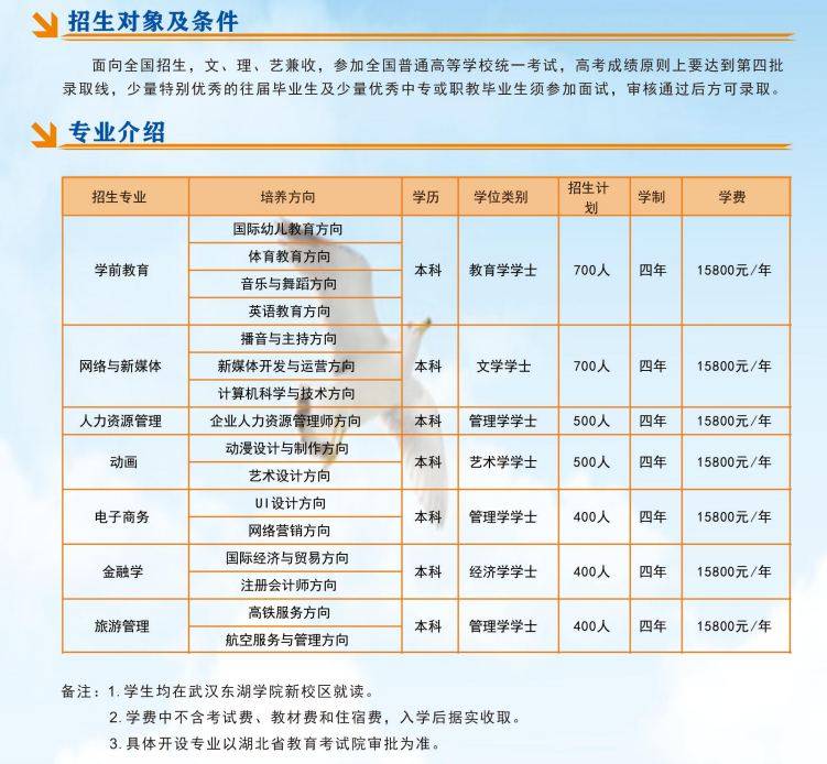 武汉东湖学院全日制本科助学班招生专业涵盖多个学科领域,包括但不限于学前教育、网络与新媒体(国家级一流本科专业建设点)、电子商务(国家级一流本科专业建设点)、动画、金融学、旅游管理、人力资源管理、工商管理、计算机科学与技术等。学生可以根据自己的兴趣和职业规划选择适合的专业。
