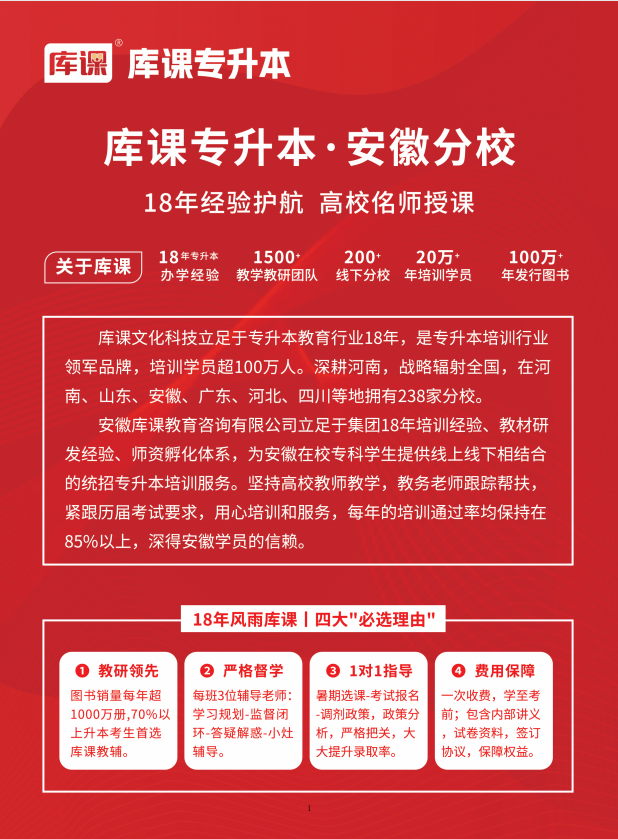 库课教育作为深耕专升本领域十余年的教育科技集团,以其“线上培训+线下培训+图书出版”三位一体的闭环教育模式,为考生提供个性化备考方案。详情请咨询下方库课专升本合肥校区负责人朱老师