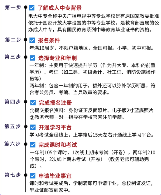 权限开通:学籍注册后 1-2 个工作日,教务老师发送 “电中在线” 平台账号(身份证号),可通过电脑端(https://zydz-menhu.ouchn.edu.cn/)或微信公众号 “中央广播电视中等专业学校” 登录学习;