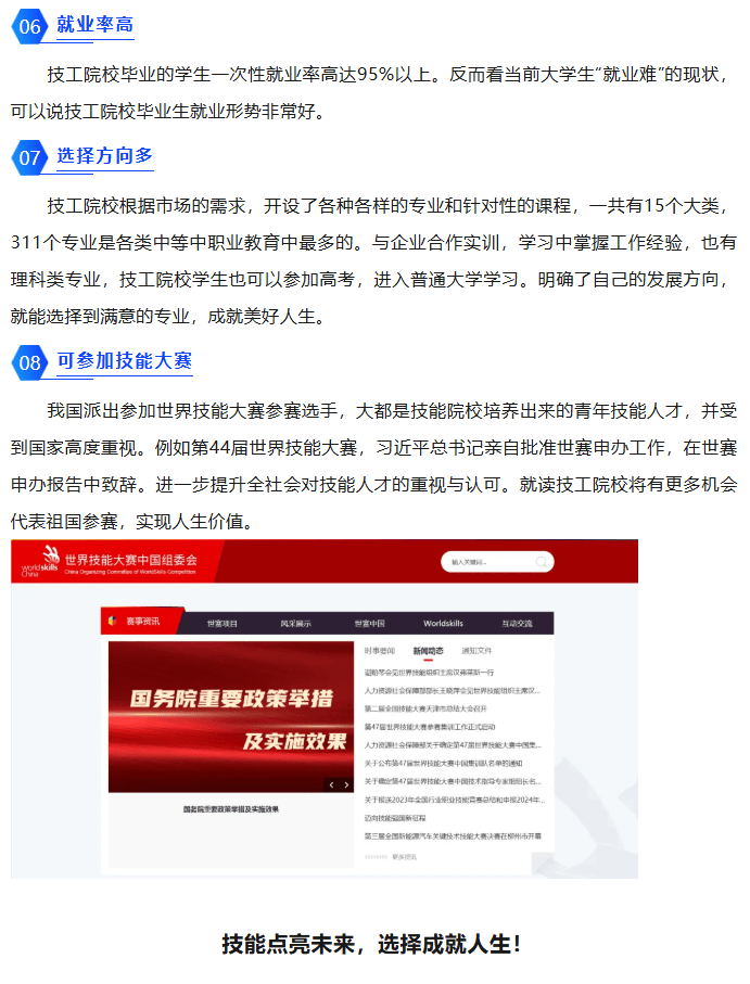 技能大赛:学校培养的学生有机会参加世界技能大赛,代表国家参赛,既能拿荣誉,也能让职业履历更亮眼。