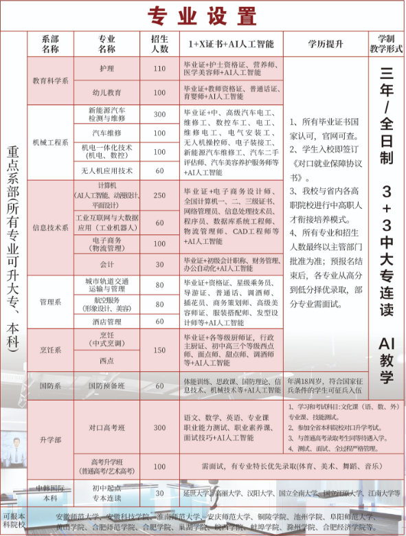 所有专业都是 “全日制三年制”,还支持 “3+3 中大专连读”,学生入校就能签《对口就业保障协议》,毕业就业有兜底。