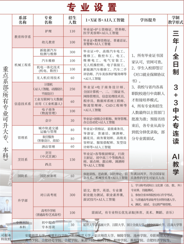 学校开设7大系部23个专业,形成"智能制造+现代服务+信息技术+健康产业"的专业矩阵,所有专业均对接合肥市"芯屏汽合"战略性新兴产业布局: