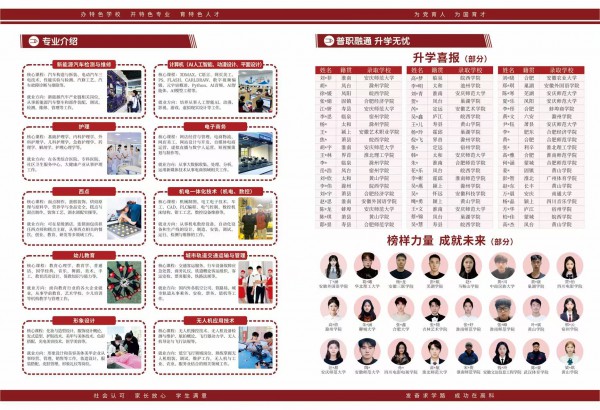 升学保障:学校开通“3+3”中大专连读通道,与淮南师范学院、合肥职业技术学院等省内多所高职院校实现学分互认,转段考核通过率超90%。2025年部分专业对口升学本科达线率高达53.87%,近三年职教高考升学率达87%,其中本科上线率32%。