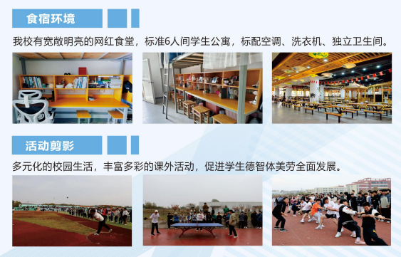 生活配套:学生公寓为6人间,配备空调、浴室、洗衣房、热水器,百兆光纤入户;食堂支持无感支付,提供多样化餐食;