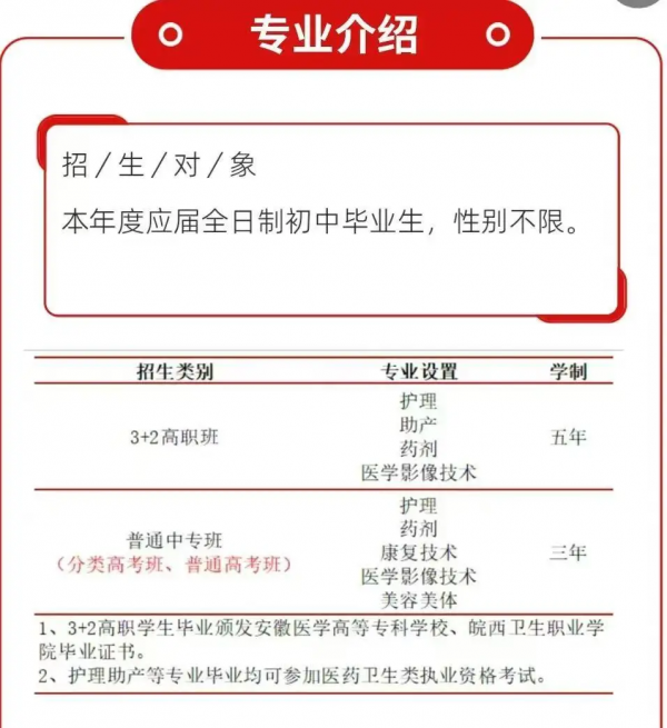 合作院校:与安徽医学高等专科学校、皖西卫生职业学院等省内知名高职院校联办,学生中专毕业后通过分类考试或对口升学考试,可升入合作院校继续深造。