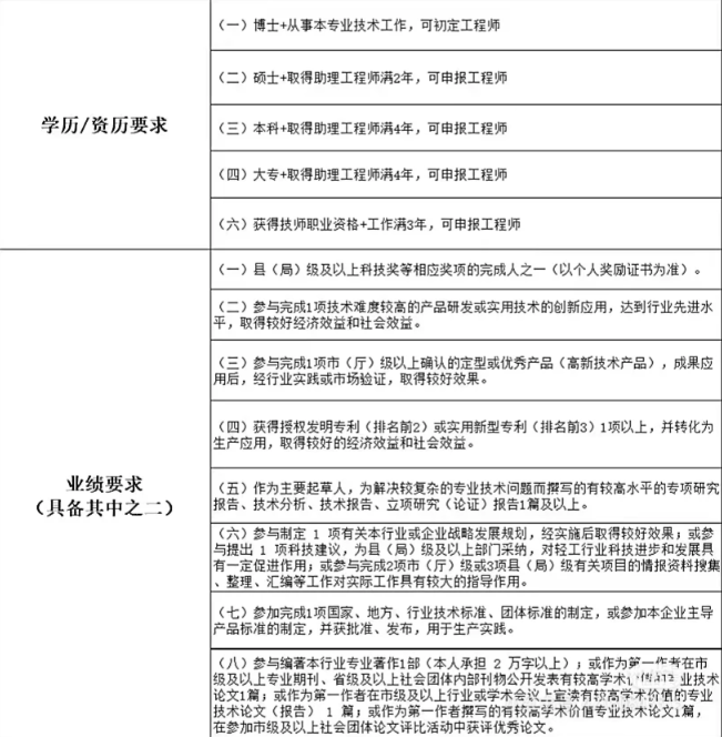 学历和资历:通常要求具备大学本科学历或学士学位,取得助理工程师职称后,从事本专业技术工作满4年;或者具备大学专科学历,取得助理工程师职称后,从事本专业技术工作满4年(具体年限可能因地区和年份而有所变化,请以官方发布的最新通知为准)。